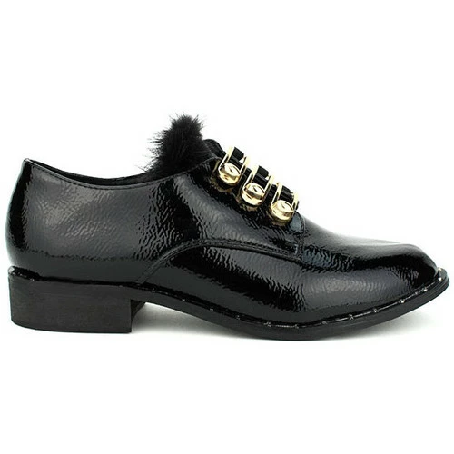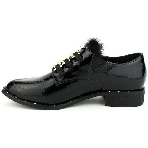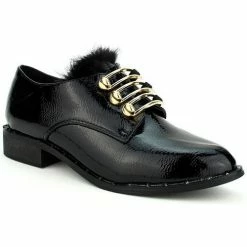 Derbies noires vernies PEYS, optez pour ces jolies derbies en synthétique verni noir. On craque pour sa forme légèrement allongé son effet cuir brossé. Ornée de jolies barrettes en métal doré façon amiral, avec attache élastique et bride élastique sur les côtés pour facilement les enfiler. Liseré fausse fourrure sur languette., Talonnette de 3cm et semelle extérieure antidérapante à rainures. Liseré rivets clous en métal sur semelle. Top Tendance et Fashion avec un jean ou une tunique pull., , ,