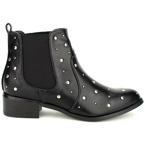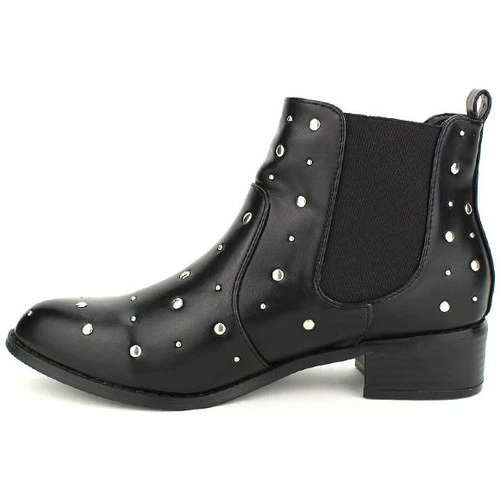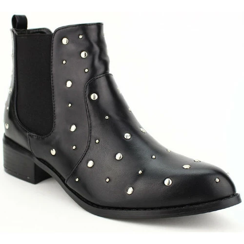Bottine noire Clous SKAYLIS, Craquez pour ces sublimes boots synthétique noir à bout pointu. La tige de 11cm est pourvue de deux bandes élastiques pour un enfilage facile. Un look rock grâce à ses multiples clous rivets en métal argenté., Une talonnette de 4cm, une semelle antidérapante à rainures et une semelle intérieure à coussinets, pour un confort obtimal., , ,