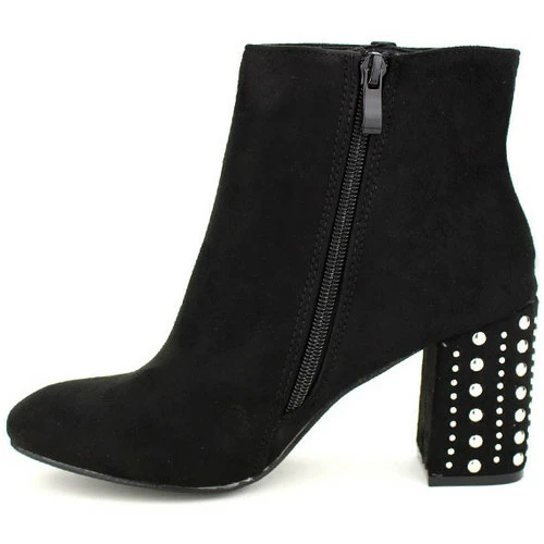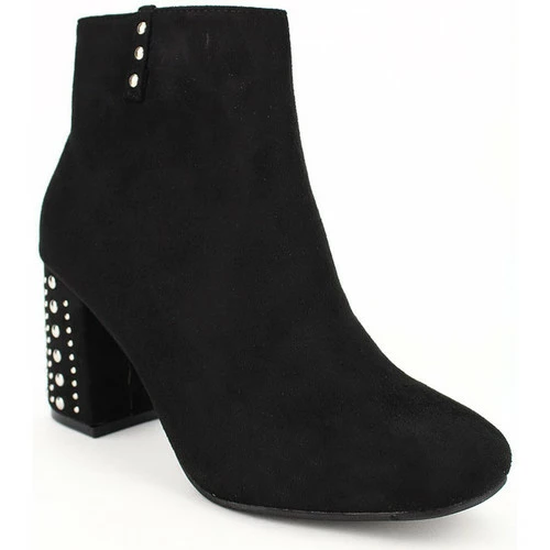 Bottine noire daim STALANE, Craquez pour ces bottines en simili daim noir. La tige est haute de 12cm avec 3 rivets boutons argentés en haut. La fermeture zip côté intérieur de tige, vous permettra de facilement les enfiler et les fermer., Son talon de 8cm est recouvert assorti et agrémenté de multiples rivets boutons argentés. Portez les avec un jean pour un look élégant et raffiné., , ,