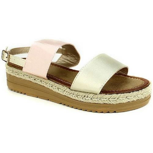 Compensées Beige and rose EXQUILY, Sublime sandale compensée à doubles brides aspect satin dorée et rose. Bride à la cheville réglable par une boucle. Légère et confortable, parfait en cette saison., Semelle compensée de 4,5cm à liseré corde façon espadrille. Semelle extérieure antidérapante à rainures., , ,