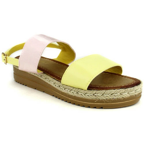 Compensées Jaune and rose EXQUILY, Sublime sandale compensée à doubles brides aspect satin rose et jaune. Bride à la cheville réglable par une boucle. Légère et confortable, parfait en cette saison., Semelle compensée de 4,5cm à liseré corde façon espadrille. Semelle extérieure antidérapante à rainures., , ,