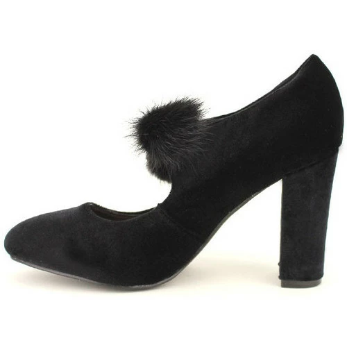 Escarpin Velours noir QUENN’S Pompon, Semelle intérieure cuir, Avec bride corde Pompons , Talon 9cm Confort , Chic & Confortable ,