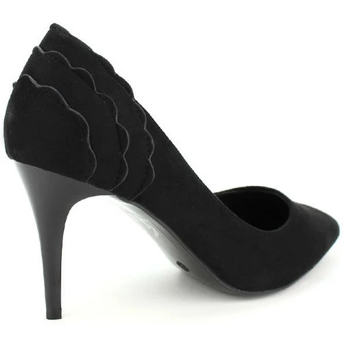 Escarpin noir STUDIO H , Escarpin pointu simili daim noir. Son détail triples volants au dos est très féminin et sexy. Indémodable du placard, toutes fashionistas possèdent une paire d’escarpin noir., Son talon aiguille de 8,5cm est noir verni. La semelle extérieure est antidérapante à rainures. Une silhouette affiné et des jambes galbés grâce à ces escarpins. Un look chic et orginale grâce à son détail au talon., , ,