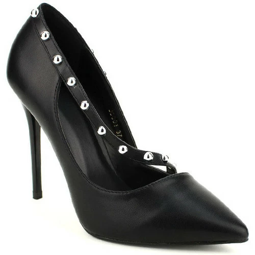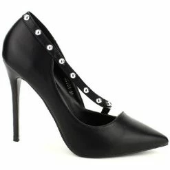 Escarpins Noirs bride clous CREATION , On craque pour ces magnifiques escarpins féminin et sexy. Escarpin à bout pointu avec un sublime décolleté décalé sur le côté. Jolies brides descendant sur le coup de pied agrémentée de demi sphères en métal argenté., Tès joli talon aiguille verni noir de 11cm. Semelle extérieure antidérapante à rainures., , ,