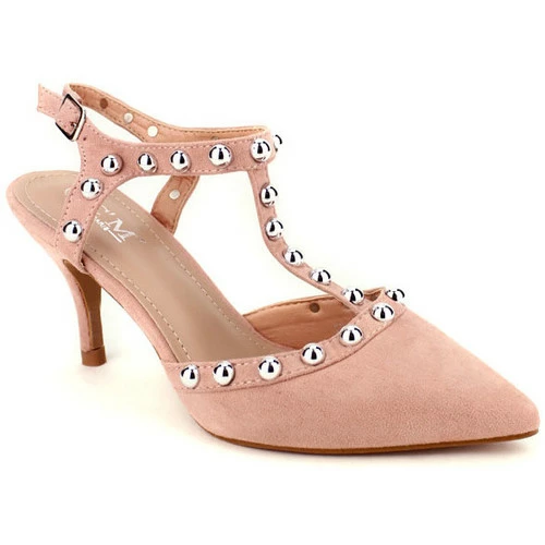 Escarpins Rose poudré C’M, Magnifique escarpin pointu salomé semi ouvert. Aspect extérieur velours agrémenté de demi sphères en métal argenté. Bride à la cheville réglable par une boucle. Très bon maintien du pied et ultra Féminin., Joli talon fin recouvert assorti de 8,5cm. Semelle extérieure antidérapante à rainures., , ,