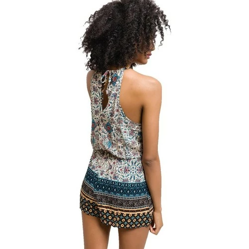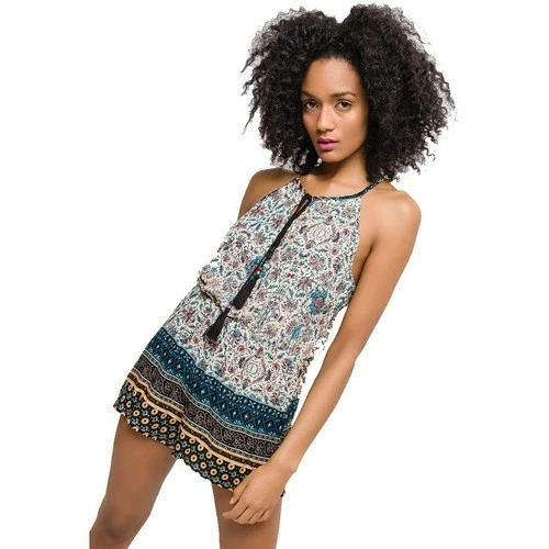 Combishort Bleu, Combishort bleu clair, resserrée à la taille par un élastique. Encolure avec petit cordon à nouer, poches sur les côtés. Tissu léger à motif d’arabesque., 100% coton, elle sera comme une seconde peau cet été, Lavable à 30°, ,