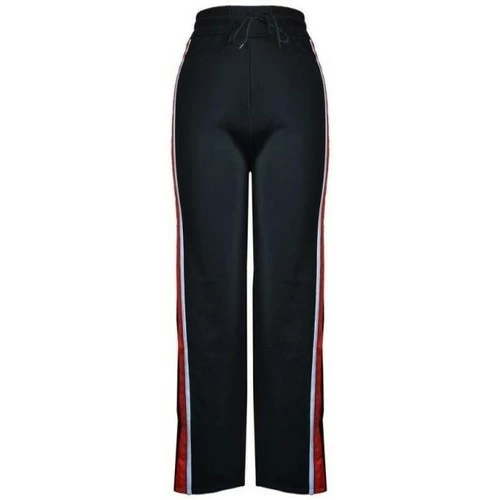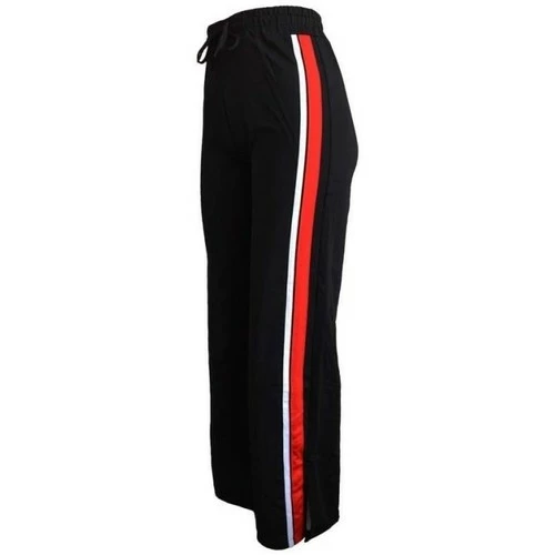 Pantalon Noir à liseré rouge FINE WOMAN, Bas de jogging uni à jambes évasées. Liseré blanc/rouge sur les cotés., Bas de pantalon fendu sur environ 15cm. Matière fluide., Composition : 90% polyester 10% élasthanne, ,