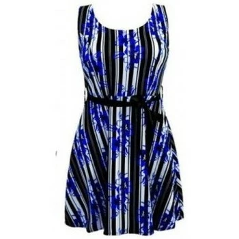 Robe Bleue Romantique, Robe colorée et élégante à larges bretelles, coupe évasée et nouée à la taille. Motif d’été en fleurs associé à des rayures verticale., Encolure ronde et fermeture à fermeture éclair au niveau du dos., Matériau: 96% polyester , 4% élasthanne. Taille Unique (convient aux tailles S, M et L)., Dimensions : longueur de la robe 81 cm largeur à la taille de 35 cm,