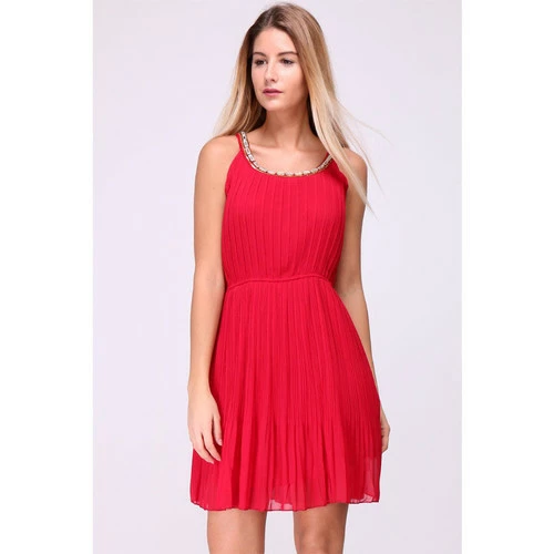 Robe Rouge plissée JIALY MODE, Sublime robe rouge plissée à col rond. Joli liseré détail bijoux au col. Robe sans manche à fines bretelles. Tissu doublé et robe ressérré à la taille. Chic et élégante, idéal en journée avec une paire de sandale à talon ou en soirée avec vos plus beaux escarpins., Robe longue d’environ 80cm. Elle est composée à 100% polyester., , ,