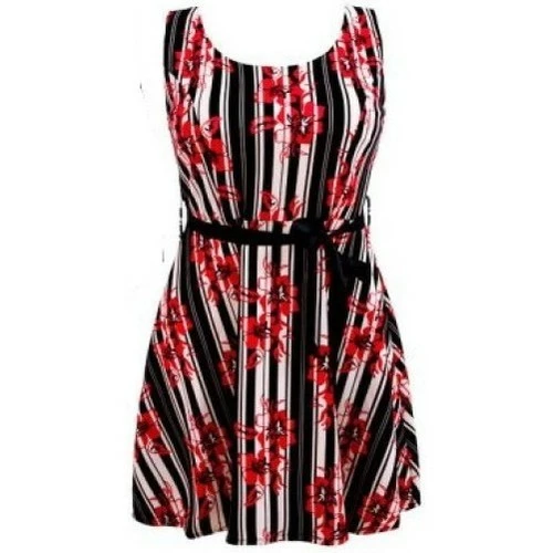 Robes Rouge Romantique, Robe colorée et élégante à larges bretelles, coupe évasée et nouée à la taille. Motif d’été en fleurs associé à des rayures verticale., Encolure ronde et fermeture à fermeture éclair au niveau du dos, .Matériau: 96% polyester , 4% élasthanne. Taille Unique (convient aux tailles S, M et L)., Dimensions : longueur de la robe 81 cm largeur à la taille de 35 cm,