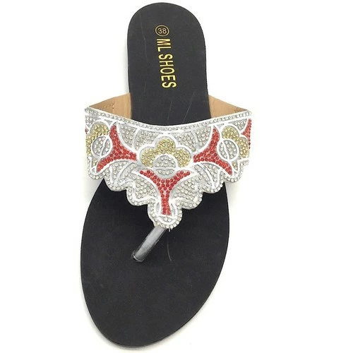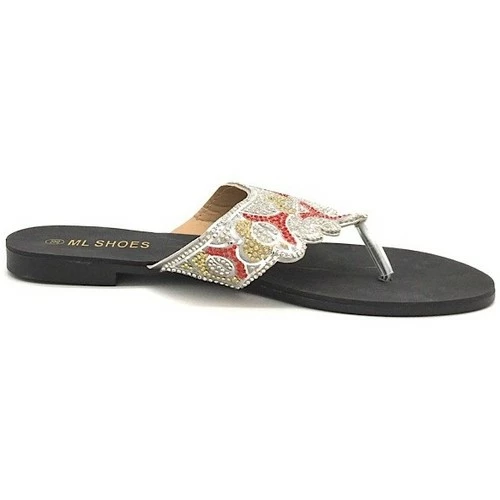 Tongs Strass Argenté ML SHOES, Optez pour ces tongs à large bride unique serti de strass argenté, avec des touches de doré et de rouge., Semelle antidérapante. Se portera à la perfection avec une jupe en jean., Chic et Confortable, ,