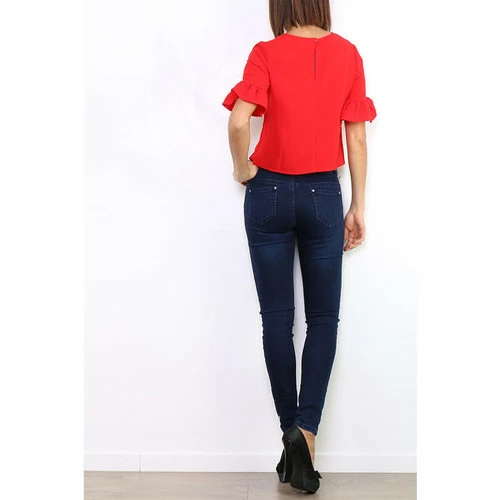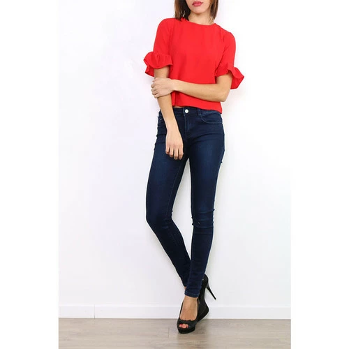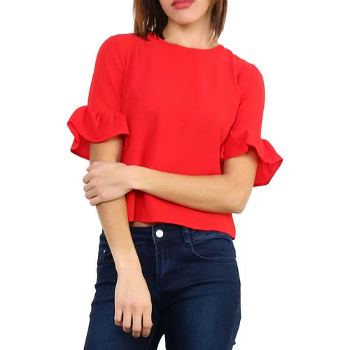 Tops Rouge JS MILLENIUM, Blouse rouge à manche mi longue à volants froufrou. Col rond prés du cou et attache bouton au dos, Composé à 100% Polyester. Très chic & tendance avec un jean, , ,