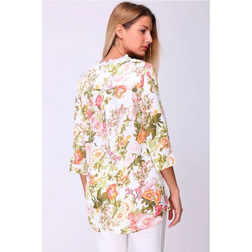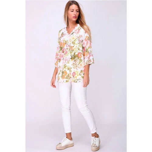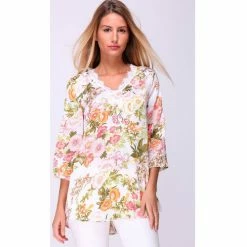 Blouse imprimé floral INTEMPORELLE, Optez pour cette jolie tunique à manches 3/4 et au col décolleté V dentelle blanche. Tunique à imprimé Flowers colors, ultra féminine et Tendance. Look printannier, idéal avec un slim ou un jean et une paire de sandales à talon., Sa longueur est d’environ 72cm et est composé à 100% polyester., , ,