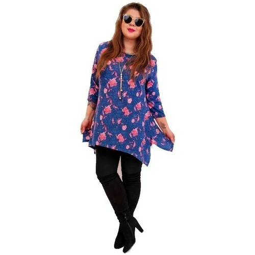Tunique Bleu à fleurs Taille PLUS, Magnifique tunique pull à motif floral, coupe ample qui affine la silhouette, , manches 2/3 et encolure arrondie, , le bas de la tunique a des coins asymétriques et allongés,, Matière: 65% coton, 35% polyester, , , ,